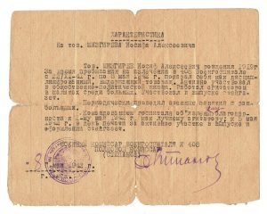 «Тов. Мизгирев Иосиф Алексеевич рождения 1919 г. за время пребывания на излечении в 408 Военгоспитале с 22/ХI-41 г. по 8 мая 1942 г. показал себя как дисциплинированный, выдержанный товарищ. Активно участвовал в общественно – политической жизни. Работал агитатором в палатах среди больных. Участвовал в выпуске стенгазет.