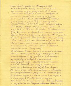 «Дом Учёных располагался в прекрасном здании — бывшем доме губернатора. В западном крыле находилась квартира секретаря горкома партии тов. Никулькова. В подвальном помещении жил с семьёй его шофёр. Во всём здании требовался капитальный ремонт. Крыша протекала, полы сгнили, окна частично забиты досками. Освещение и оборудование сцены в аварийном состоянии. Мощности котельной хватало только на жилую часть здания. В зрительном зале было холодно, на лекциях и курсах люди сидели в пальто. В необорудованном помещении библиотеки книги лежали на полу. Мебель и картины обветшали. Биллиардный стол был разбит, сукно порвано. Везде сыро и грязно. Собственных средств Дом Учёных не имел. Штат: бухгалтер, режиссер, библиотекарь и сторож-швейцар. Заработная плата выплачивалась нерегулярно из временных источников. В Совет Дома Учёных входили: профессора Хлопков А.М., Серебров В.Т., Кузнецов В.Д., Широких В.Н., а также зав. культотделом горкома Радько И.Ф., и я, как директор. В таком состоянии я принял Дом Учёных в июне 1933 года. При содействии тов. Радько И.Ф. получили от Горсовета десять тысяч рублей. Ремонт начался. Средства расходовались по согласованию с хозяйственной комиссией, во главе с проф. Серебровым В.Т.. Советом было принято решение обратиться за оказанием помощи в краевые организации. В Новосибирском Крайисполкоме я добился 20.000 руб, от Краевого Совета Высшей школы 15.000 руб. и Крайпрофсовета 10.000 руб. Ремонт помещений и строительство новой котельной закончили в октябре. Начали работать курсы Марксизма-Ленинизма, кружки: вокально-музыкальный, прикладного искусства. Открыла двери библиотека. Заработал биллиардный зал. Был организован буфет от столовой научных работников, где можно было получить горячие и холодные закуски. Там же продавалось бутылочное пиво (с разрешения горкома партии). Силами драматического кружка ставились оперы: Евгений Онегин и Русалочка. Постановки и концерты имели большой успех. Кроме того, читались лекции профессорами: Мясниковым, Баяндуровым, Бутаковым и Усовым. От этих лекций, можно сказать, ломились двери, т. к. удовлетворить всех желающих не было возможности. Слава Дома Учёных с каждым днём росла, отмечалась хорошая работа в прессе».
